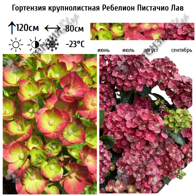 Гортензия крупнолистная Rebellion® 'Pistachio Love' (Пистачио Лав) - очаровательный листопадный кустарник, вырастающий до 1,2 м и шириной до 0,8 м. Листья сердцевидные, с отчетливым кончиком, темно-зеленого цвета. Богатые, сферические соцветия появляются на новых побегах с июня по сентябрь. Это сорт-хамелеон с экзотической расцветкой, Окраска у гортензии Фисташковая любовь динамичная, молодые соцветия имеют фисташково зелёный оттенок, а по мере цветения постепенно окрашиваются в яркий малиново-розовый или малиново-красный цвет. Окраска цветков зависит от PH почвы. Более кислая почва поддерживает окраску цветов в синий цвет, а более щелочная почва способствует розовой окраске. Гортензия умеренно требовательна к росту, но если дать ей благоприятные условия выращивания, она отплатит вам пышным ростом и обильным цветением. На прошлогодней древесине цветет крупнолистная гортензия, поэтому весной мы снимаем только поврежденные морозом побеги.  Этот кустарник великолепен в качестве солитера, но он также найдет свое место в саду, на клумбе или на террасе. Идеальный сорт для флористики (долго стоит в срезке).