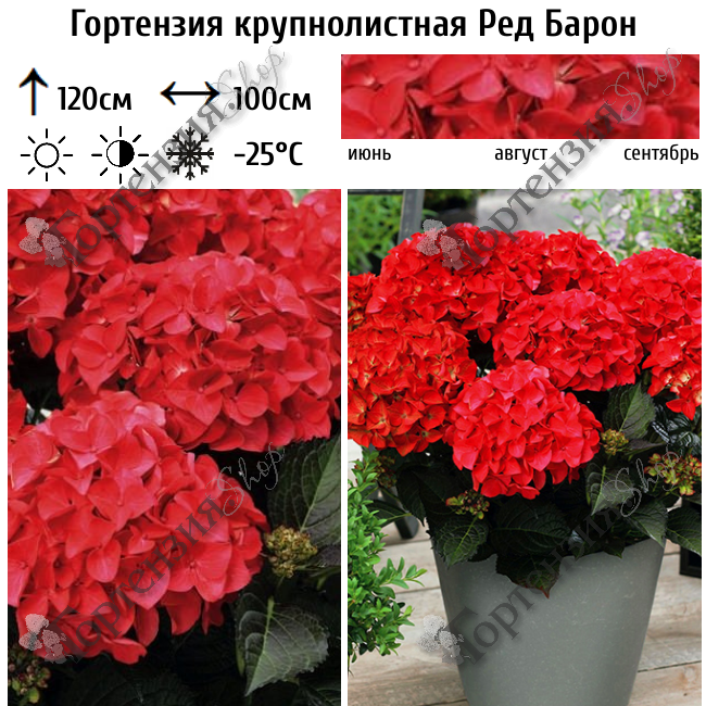 Гортензия крупнолистная 'Ред Барон'- цветущий листопадный кустарник.  Высота куста до 120 см, ширина до 100 см. Листья зеленые, ветви прямые. Цветет с июня по сентябрь. Цветы  розово-красный или пурпурные в зависимости от кислотности почвы. Цветет на прошлогодних побегах.  Почва должна быть кислая, влажная,  но без застоя воды. Зимостойкость -25С, зимой требуется укрытие.  Используется для миксбордеров, живых изгородей, контейнерного выращивания, на срезку.