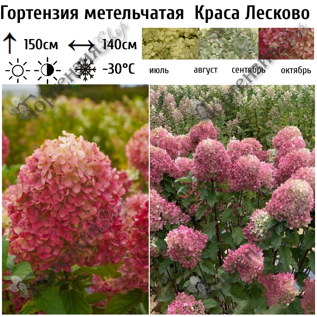 Краса Лесково - первый сорт гортензии выведенный в России, питомником Лесково. Куст высотой до 1,5 метров и шириной до1,4м. Крона густая округлая. Побеги красно- коричневого цвета прочные и крепкие. Самой привлекательной частью растения являются соцветия. Стерильные цветки из четырех лепестков собраны в плотные, ширококонические метелки, 25-30 см. Цветет с июля по сентябрь. Этот сорт характеризуется постепенной сменой оттенков соцветий. В начале цветения белые, далее нежно розовые и к концу цветения насыщенно розовые. Еще одной изюминкой сорта является, то что розоветь она начитает и с макушки и снизу соцветия. Морозостойкость до -30 С зимует без укрытия.