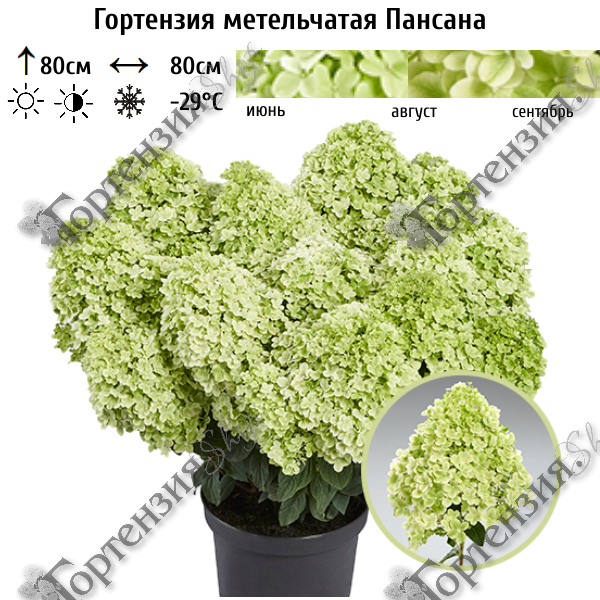 Метельчатая гортензия ‘Pansana’ - эксклюзивная серия патио немецкой селекции PAN.Компактный, хорошо разветвленный куст высотой до 100 см. Ветви крепкие, прямостоячие, покрыты листвой интенсивно-зеленого цвета.