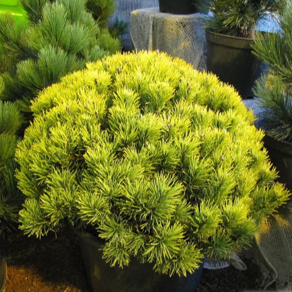 Сосна горная 'Карстенс Винтерголд' - красивая карликовая сосна, к 10-ти годам высота 40 см, диаметр 50 см, в молодом возрасте немного рыхлая, затем более компактная. Высота взрослого растения: 0,7 м. Диаметр кроны взрослого растения  до 1 м. Хвоя весной и летом зелёная, зимой яркая, золотисто-жёлтая, очень эффектна на фоне снега. Место солнечное. Морозостойкость -40С.