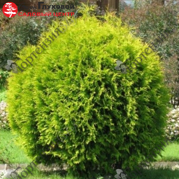 Туя западная Голден Глобе – вечнозеленый низкорослый кустарник сферической формы, высотой до 1,0 метра. Многочисленные побеги равномерно разрастаются в стороны. Форма куста — шарообразная, внутри шара листва яркого зеленого цвета, а по внешним краям — золотисто-желтая. Растет медленно. Предпочитает солнечные места и легкую полутень. Не рекомендованы посадки в местах с сильными ветрами, невлажной почвой и сухим воздухом.Зимостойкость высокая.