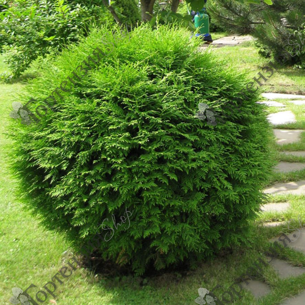 Туя западная `Вудварди`, Thuja occidentalis `Woodwardii` - шаровидный кустарник с плотной кроной. Взрослое растение достигает в высоту 1,5 м, в диаметре 1,5-2 м. Растет быстро - ежегодный прирост до 10 см. По мере роста ветви туи больше раздвигаются в стороны и крона приобретает яйцевидную овальную форму. Хвоя чешуйчатая, насыщенного зеленого оттенка, к зиме слегка рыжеет. Хорошо переносит обрезку, и чем чаще она производится, тем гуще и пышнее становится крона.Почва: свежие, увлажненные, плодородные суглинистые.Для посадки следует выбирать солнечные участки или полутень.
