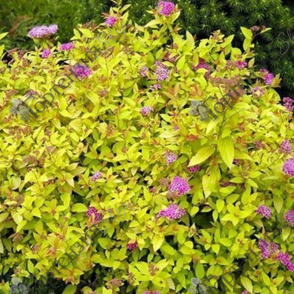 Спирея японская 'Голдмаунд' ( Spiraea japonica 'Goldmound') - Красивоцветущий небольшой кустарник до 0,6 м высотой, с плотной, полукруглой кроной. Листья ланцетные, насыщенного желтого цвета в течение всего вегетационного периода. Обильно цветет с июня по июль, розовыми цветками, собранными в плоские щитковидные соцветия. Растет медленно. Зимостойкость высокая. Светолюбива, к почвам нетребовательна, но лучше цветет на рыхлых, плодородных и увлажненных. Устойчива в городских условиях. Для поддержания красивой формы кроны необходима весенняя обрезка.