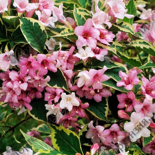 Вейгела цветущая Нана Вариегата (Weigela florida 'Nana Variegata') Кустарник высота 1,5 м, листья золотисто-пёстрые, окаймленные, цветки розовые, цветёт в конце мая-начале июня на прошлогодних побегах. Цветки трубчатые, образованы 5-ю лепестками, напоминают вытянутые колокольчики. Образуют соцветия  по 3 – 4 штуки в каждом. Источают приятный аромат. Длина цветка - до 4 сантиметров. Место солнечное или полутенистое. Лучше всего подходят влажные хорошо дренированные и плодородные участки. Молодые побеги красно-бурые, зрелые - коричневые.