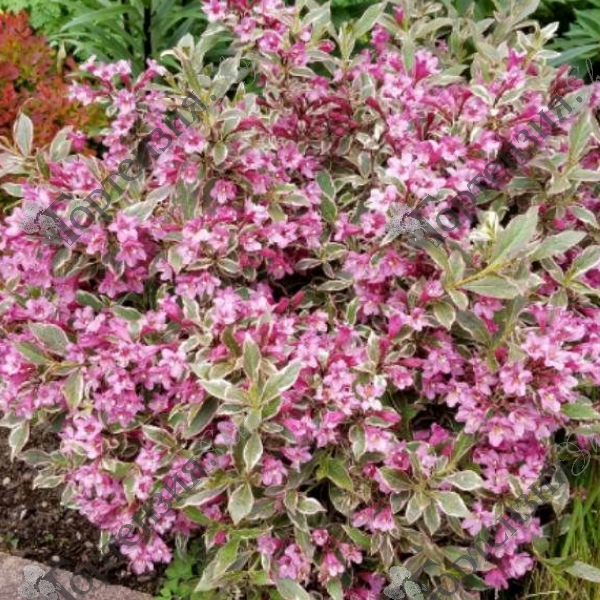 Вейгела цветущая Олл Саммер Монет (Weigela florida All Summer Monet) – низкорослый лиственный кустарник высотой и шириной до 50 см с округлой компактной кроной. Листья пильчатые тёмно-зелёные, с фигурной беловато-розовой каймой, придают растению декоративность даже без цветков. Цветы колокольчатые розовые. Начинает цвести в конце мая или начале июня. В течение месяца кустарник буквально усыпан цветами и выглядит нарядно. В ландшафтном дизайне хорош как в одиночных, так и в групповых посадках. Можно использовать в качестве живой изгороди, бордюра.