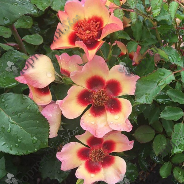 Роза миниатюрная Fancy Babylon Eyes - это удивительное сочетание ярких персиковых лепестков с темно-красным базальным пятном в основании лепестков, создающее гармоничный контраст цветов. В процессе цветения, оттенки цветков меняются, добавляя изысканный акцент в саду. Цветки простые, около 6 см, обладают легким ароматом, что придает им особый шарм. Цветение обильное, повторное в течение сезона. Листва устойчивая к заболеваниям. Куст компактный, высотой 50-70 см. Рекомендуется как бордюрная, контейнерная или балконная роза.