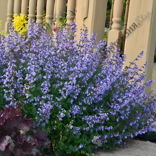 Котовник фассена 'Парсиан Блю' (Nepeta faassenii 'Purrsian Blue') Куст компактный, высота куста 30 см, шириной 30 см. Листья сердцевидные, зубчатые, зеленые, опушенные. Цветки крупные, трубчатые сине-фиолетовые в мутовчатых, соцветиях длиной до 10 см. Цветение очень долгое и обильное, с середины лета, на солнечном месте. Растение полностью ароматное. Очень хорошо подходит для выращивания в контейнерах. Почва лёгкая, дренированная.